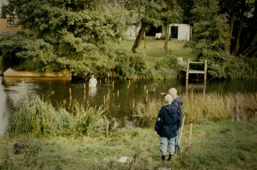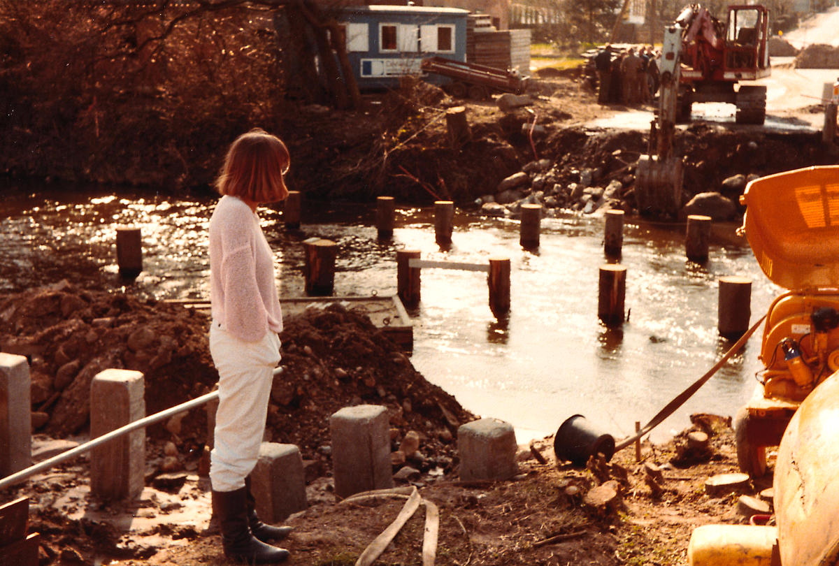 Foto fra 1970`erne. Edith og Asbjørn Larsen står i haven ved mejeriet i Voervadsbro og kigger ned på Gudenåen. Stolperne i vandet markerer hvor den gamle træbro fra 1770`erne krydsede åen.