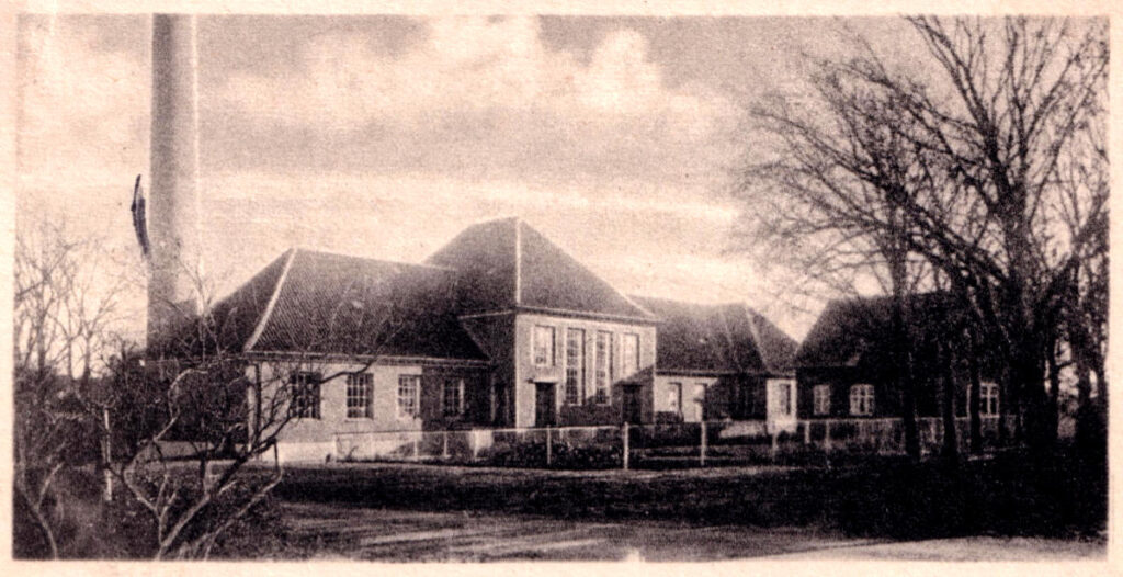 Hovedbygningen stammer fra 1920 og til højre ligger en lille bygning med et dueslag. Her startede O.E. Andersen i 1920 en kemisk fabrik, hvor der blandt andet blev fremstillet svejsepulver.